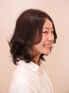 ハーフドライ後、ムースをつけて自然乾燥。 その後、全体をほぐしてから毛先にワックスをつけて仕上げる。